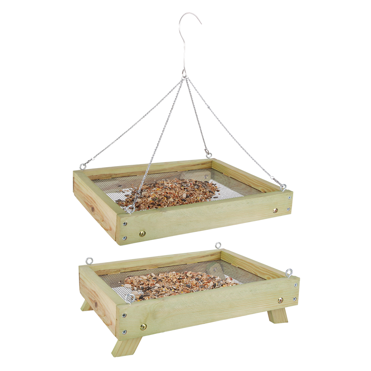 Deze voedertafel is op twee manieren te gebruiken. Door de pootjes uit te klappen kan de voedertafel op het gazon worden geplaatst en gemakkelijk worden verzet. Ook kan de voedertafel opgehangen worden. Op de grond geplaatst trekt de voedertafel andere vogels aan zoals de huismus, roodborst, merel, ringmus winterkoning en spreeuw. Als de voedertafel wordt opgehangen kan deze vogels zoals de koolmees, pimpelmees en staartmees aantrekken. De gazen bodem zorgt voor een optimale waterafvoer. kan zowel op de grond als hangend worden gebruikt kan gemakkelijk worden verplaatst gemakkelijk schoon te maken met onze voedertafelschraper FB529 L 27,8 x B 35,4 x H 11,2