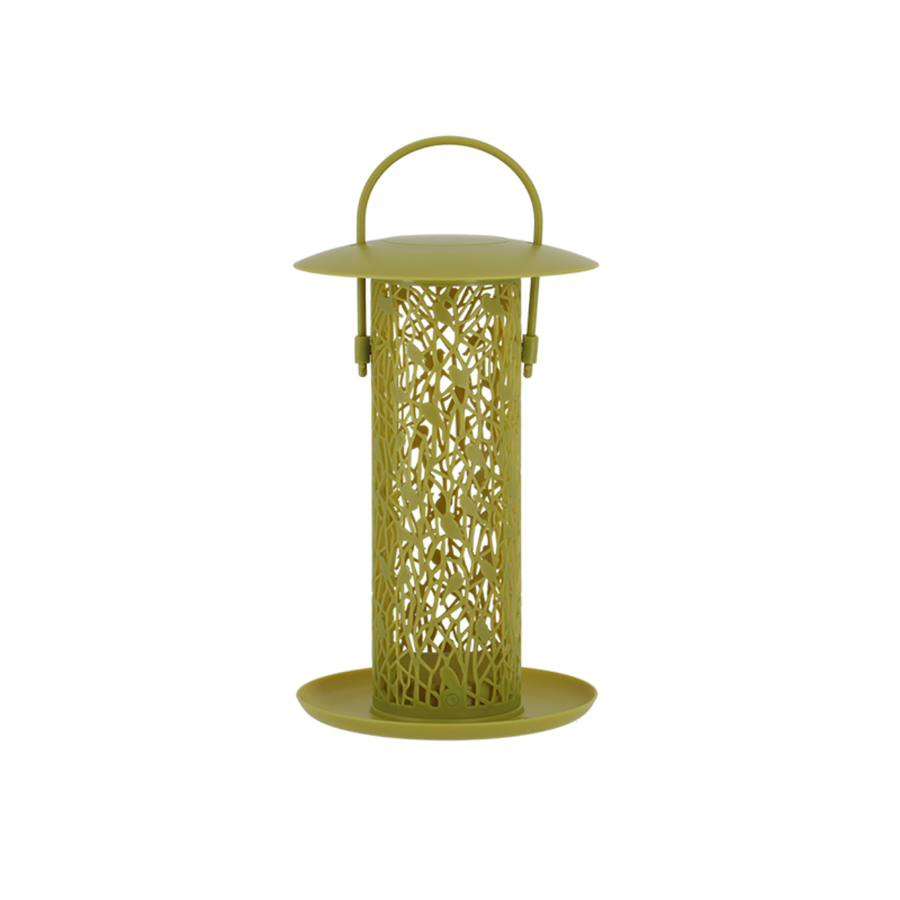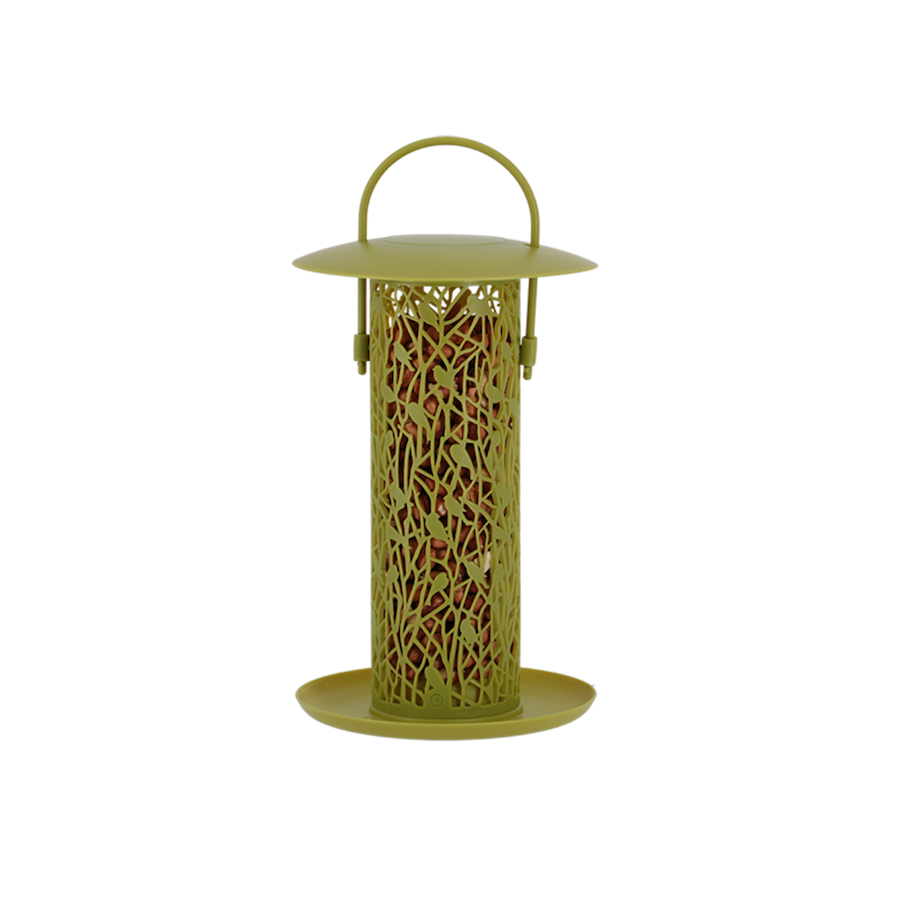 Deze notensilo met tray in trendy groen heeft een open structuur zodat de vogels gemakkelijk van het voer kunnen genieten. Door het deksel omhoog te schuiven is de silo eenvoudig te vullen en door de grote haak gemakkelijk op te hangen.