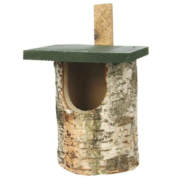 Als nestkast valt hij amper op. Deze uitgeholde berkenstam gaat mooi op in de natuurlijke omgeving van uw tuin. De nestkast heeft een half open invliegopening en is daarmee bijzonder geschikt voor roodborst, winterkoning, witte kwikstaart en grauwe vliegenvangers. Invliegopening 32mm