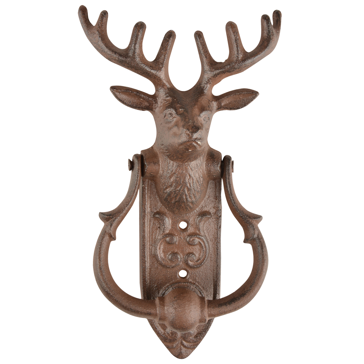 Hang de traditionele gietijzeren deurklopper met decoratieve hertenkop naast de voor- of achterdeur zodat de gasten van zich kunnen laten horen als ze willen binnentreden. Deze rustieke gietijzeren deurklopper is met de hand gegoten volgens eeuwenoud vakmanschap en traditie.