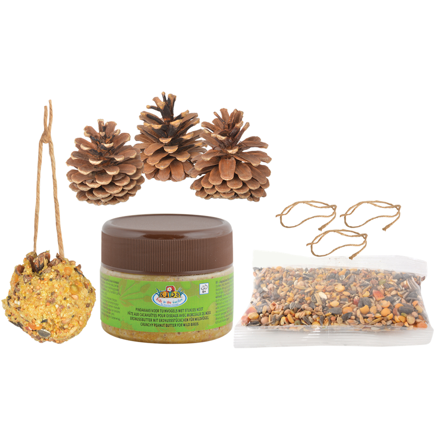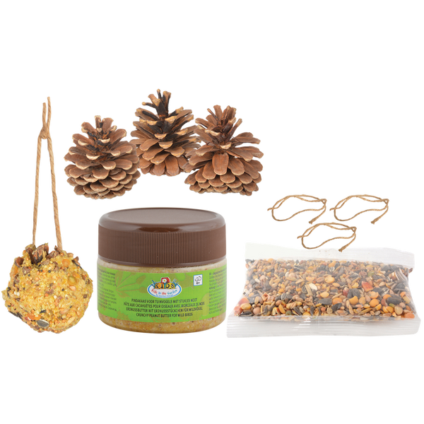 • set bestaande uit: drie dennenappels, vogelpindakaas, vogelvoer en drie stukjes ophangtouw