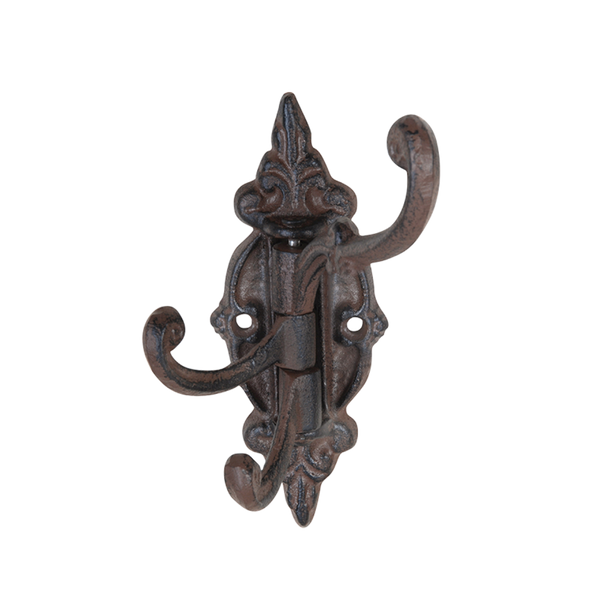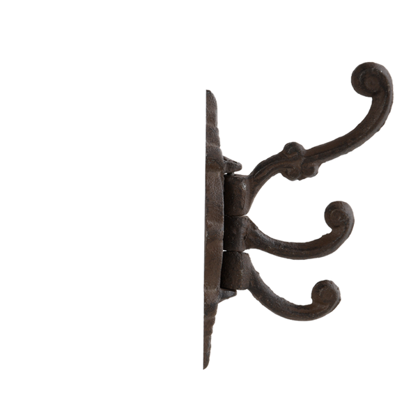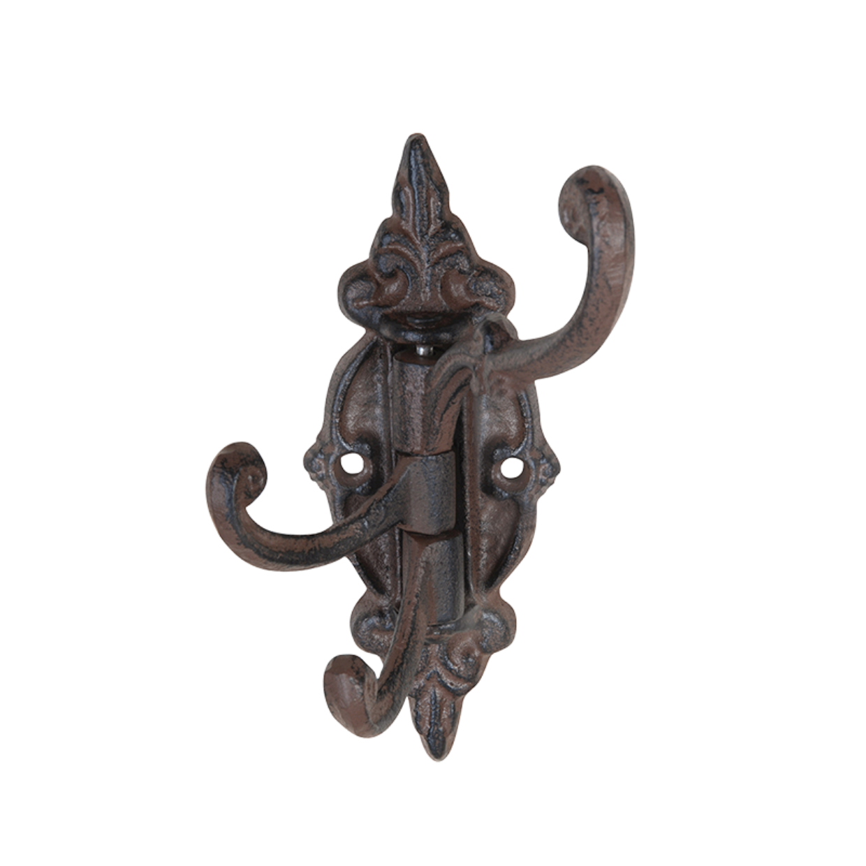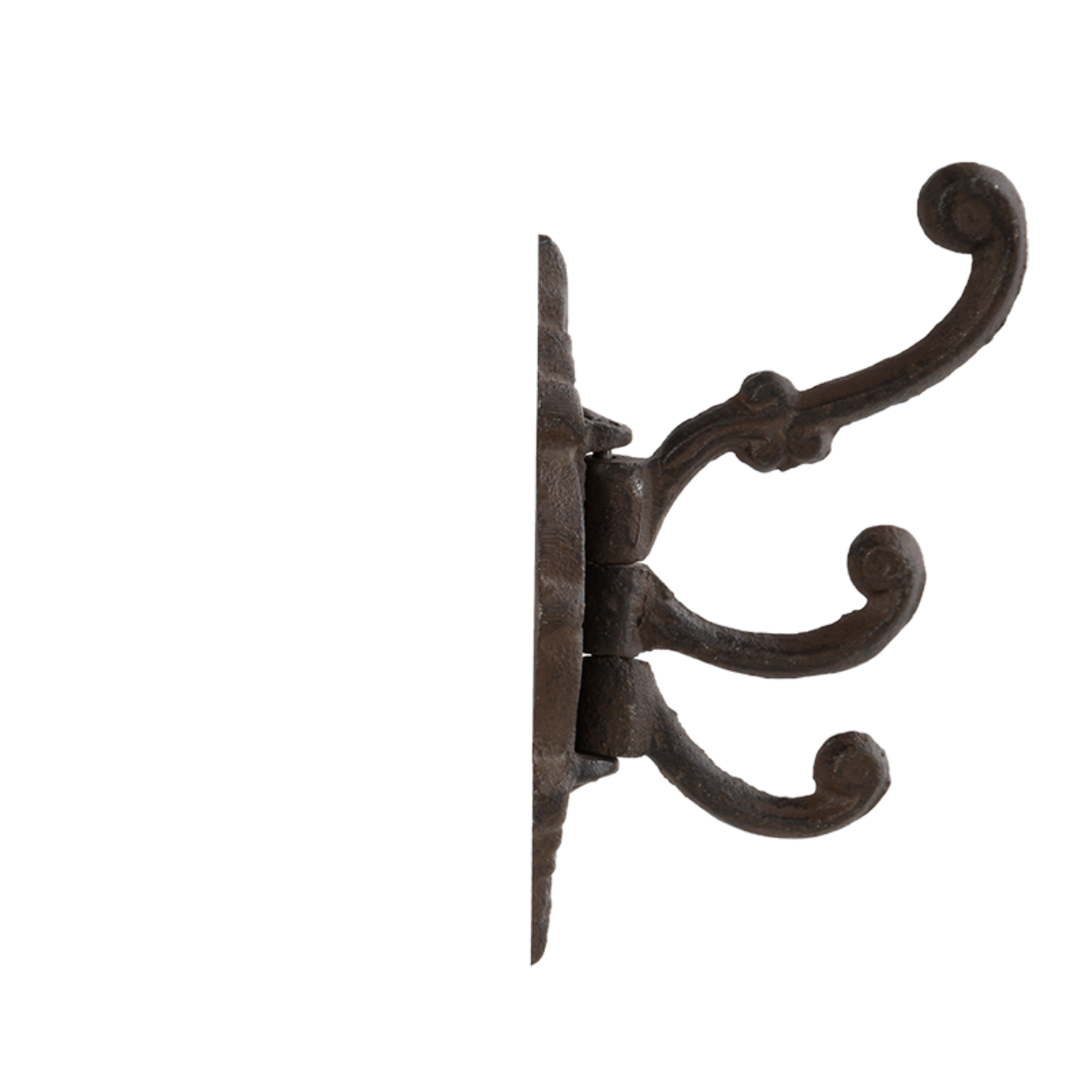 Op de drie verschillende lengtes van de haken die ook nog individueel te stellen zijn, kan van alles opgehangen worden. Deze decoratief gietijzeren draaibare haak is met de hand gegoten volgens eeuwenoud vakmanschap en traditie.