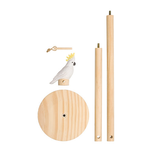 De keukenrolhouder bestaat uit drie eenvoudig te monteren onderdelen, verpakt in een eenvoudige geschenkverpakking. De doos bevat een bodemplaat, middenstaven (in twee verschillende lengtes) en een handgemaakte kaketoe. Onder de basis zijn rubberen voetjes bevestigd die als antislip werken en het hout beschermen tegen vochtige oppervlakken. Veeg de houder schoon met een vochtige doek.