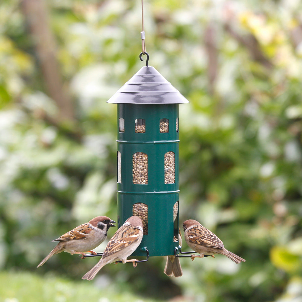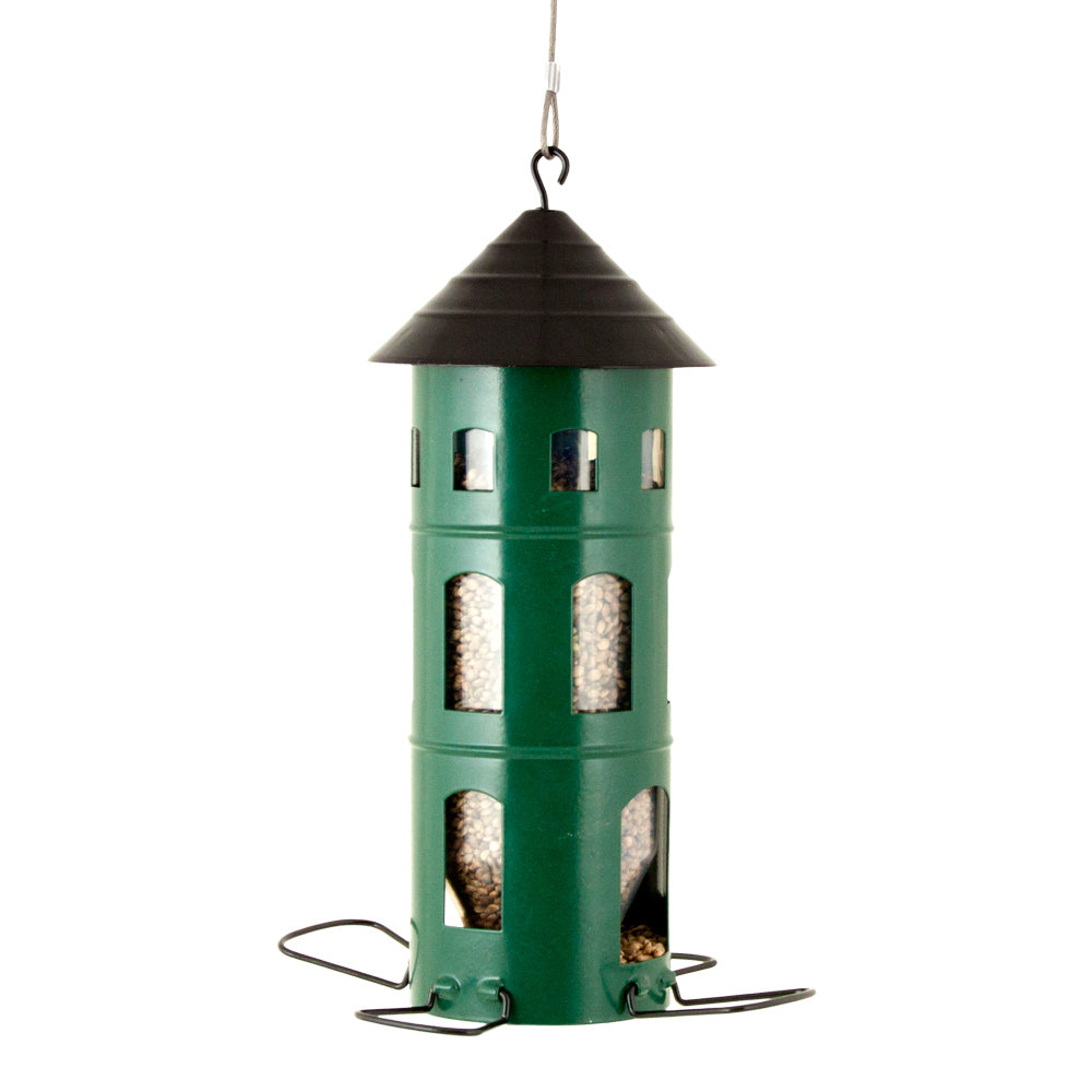 Een hangende vogelvoederautomaat Vogels voeren is een favoriete bezigheid voor velen. Deze hangende vogelvoederautomaat kan gebruikt worden voor alle vogelzaden maar ook voor appels en vetbollen. In de klassieke kleur groen is het een mooie blikvanger in de tuin of op het balkon. Goudvinken houden van zonnebloempitten De Kombimatare Frö wordt geleverd met een plastic inzetkoker waarmee allerlei soorten vogelzaad kunnen worden aangeboden. Bijvoorbeeld zwarte zonnebloempitten waar Goudvinken en Groenlingen gek op zijn. Als de inzetkoker uitgenomen wordt kan de Kombimatare gevuld worden met appels of vetbollen. Makkelijk op te hangen Hang de voederautomaat in de dichtstbijzijnde boom, op het balkon of in de patio. Alles wat u nodig heeft is de bijgeleverde ophangdraad en iets om die aan te bevestigen. Zitbeugels in twee verschillende afmetingen worden bijgeleverd. Gewicht: 0,4 kg Kwaliteit: Gepoederlakt staal, Kunststof inzetkoker Afmeting: 110 x 110 x 255 mm Hoedanigheid: 1,2 l Montage: Ophangkoord