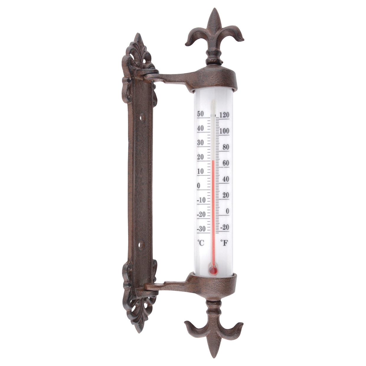 Wat handig, met deze kozijnthermometer is het mogelijk om van binnen de buitentemperatuur af te lezen. De thermometer wordt aan het kozijn bevestigd, en kan dan bijgedraaid worden om vanuit elke gewenste positie de temperatuur tussen -30°C en +50°C (-20°F en +120°F) af te lezen. Deze decoratief gietijzeren kozijnthermometer is per stuk met de hand gegoten volgens eeuwenoud vakmanschap en traditie.