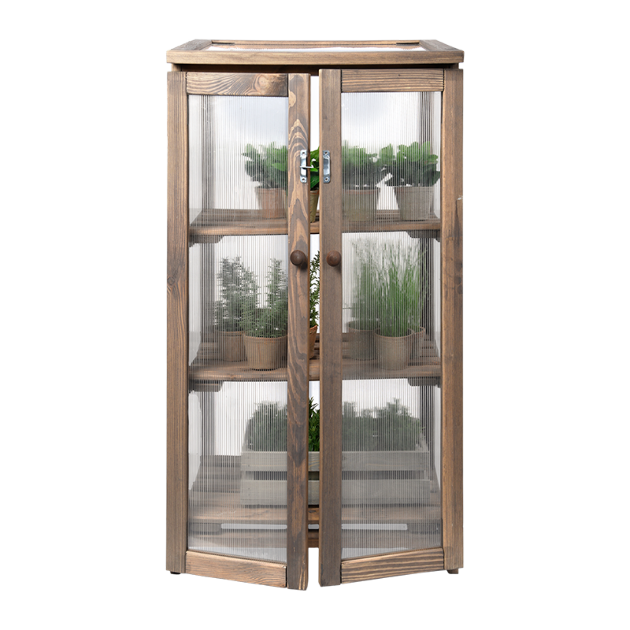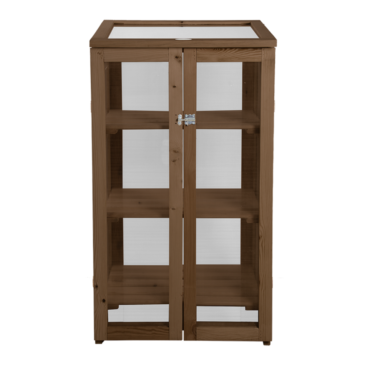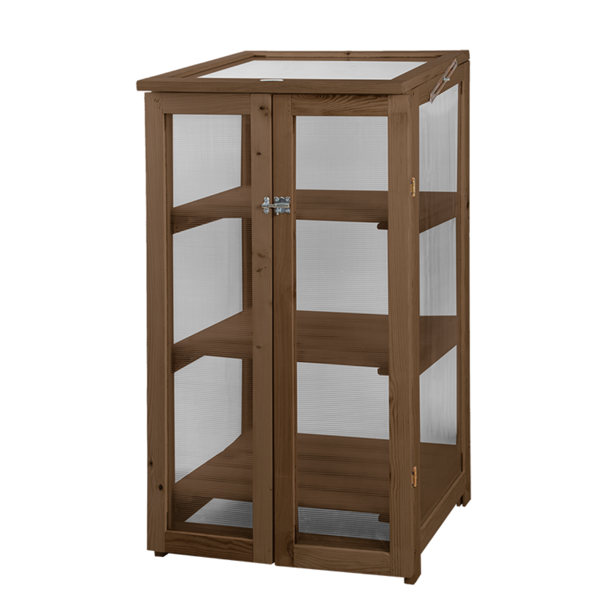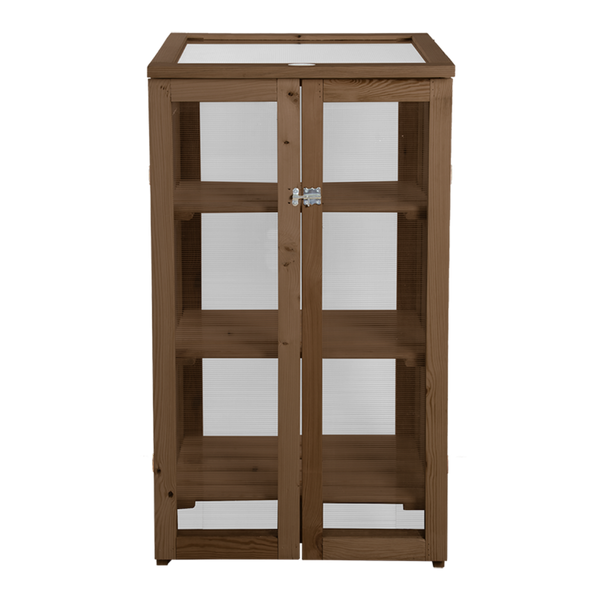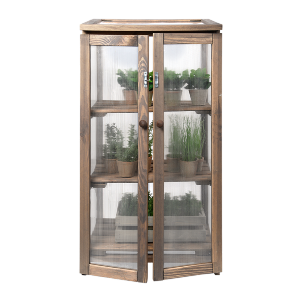 Deze kas is voorzien van polycarbonaat ramen en heeft drie schappen. De polycarbonaat ramen verstrooien het licjt waardoor planten niet (snel) verbranden. Het dak van de kas kan worden geopend voor een extra "boost" zonlicht.