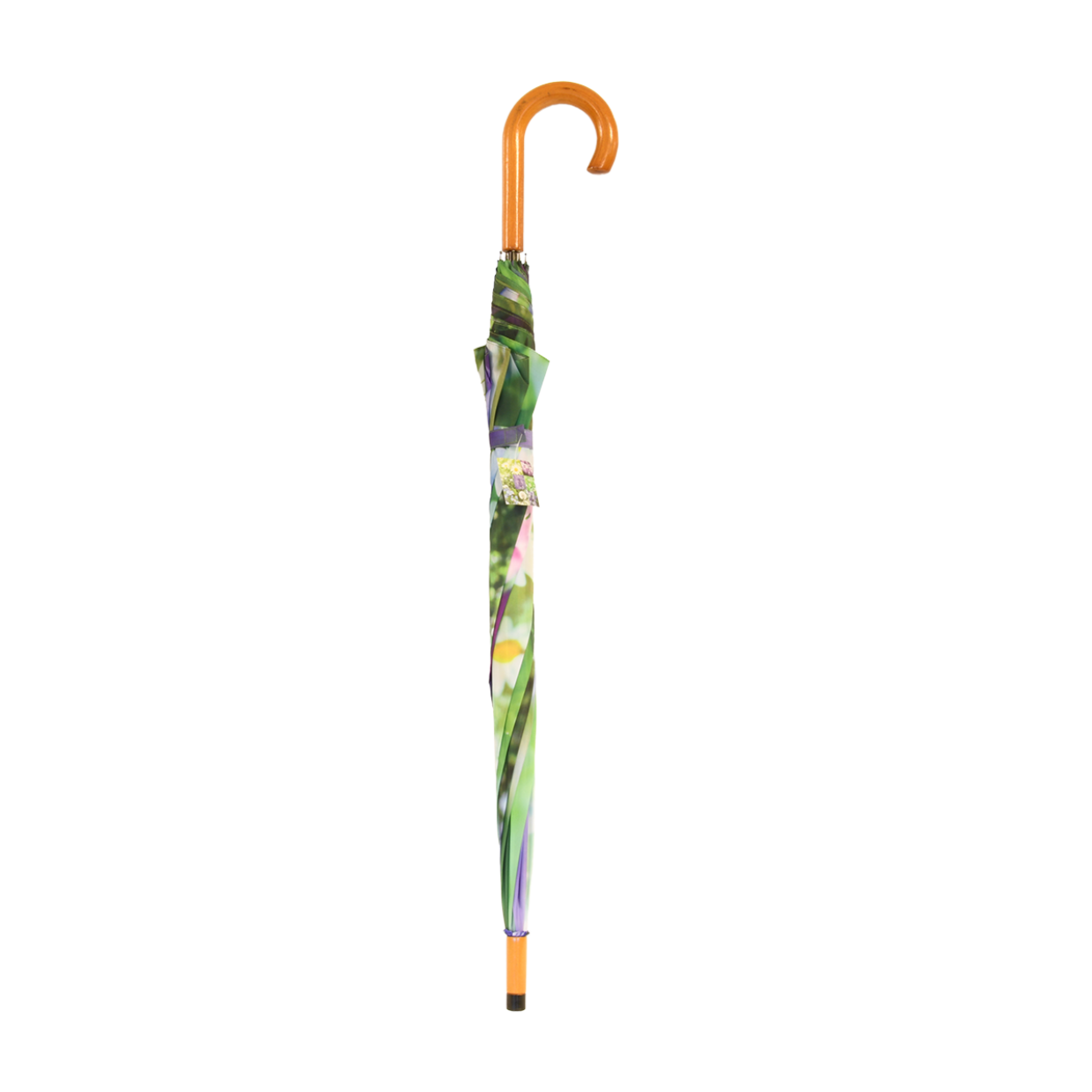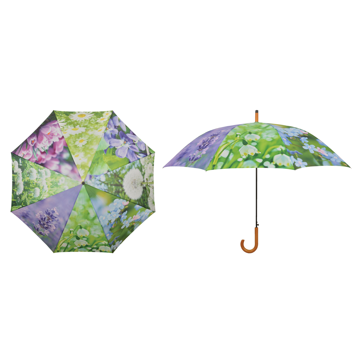 Met deze fotoprint paraplu, is zelfs een wandeling in de regen een plezier. De print omvat acht verschillende bloemen: madeliefjes, violtjes, paardebloemen, vergeet-mij-niet, lenteklokjes, lavendel, klaver en krokussen.