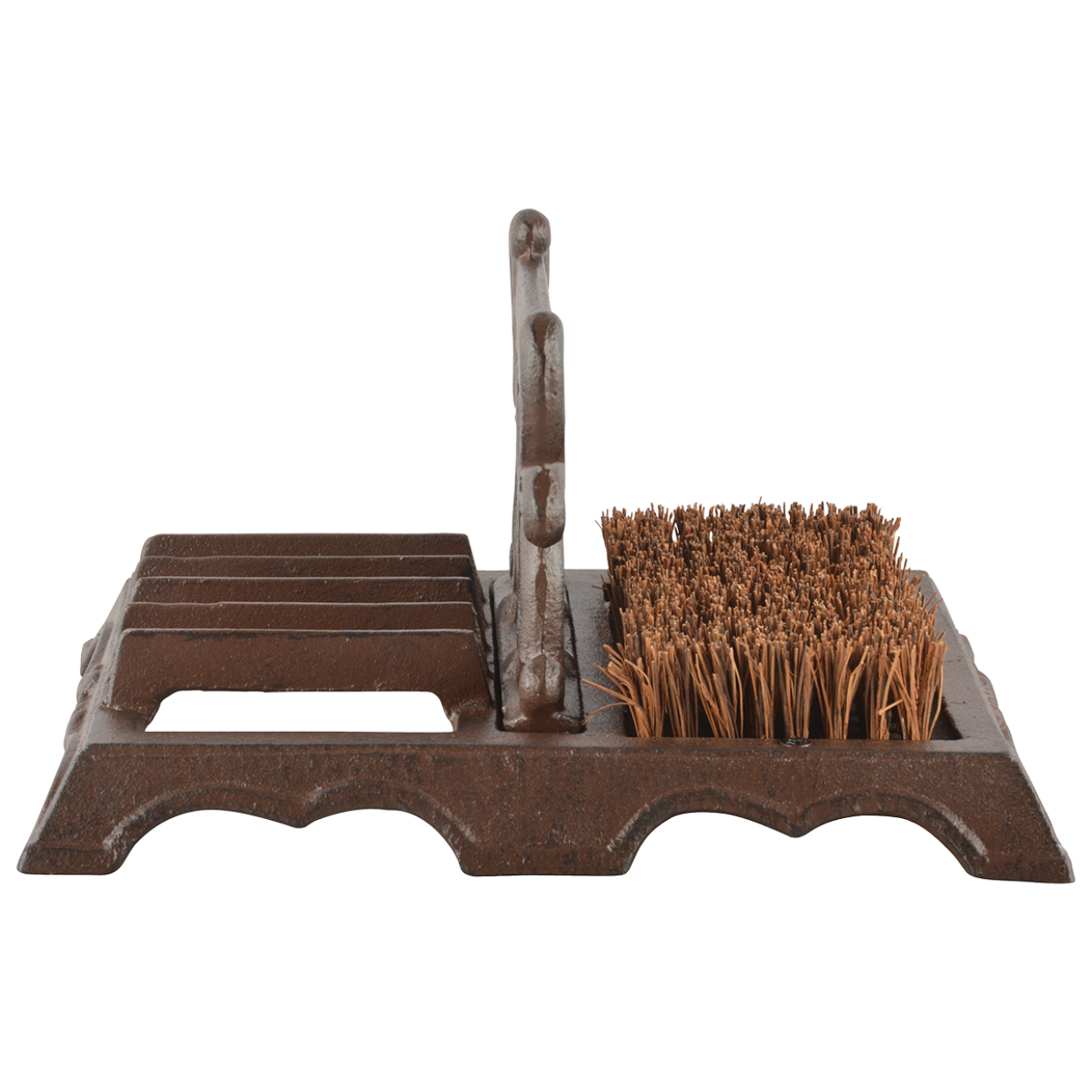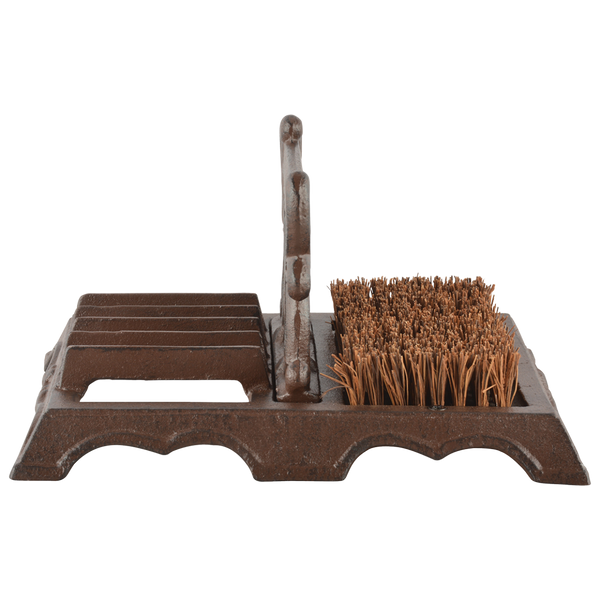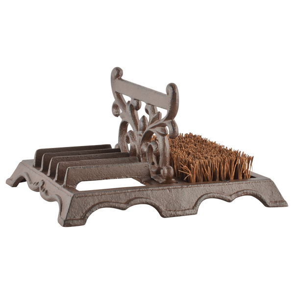 Deze decoratieve gietijzeren voetenveger is ideaal voor het schoonmaken van het schoeisel. Om de zolen te reinigen zit er in het midden en aan de zijkant een schraper voor het grof vuil, en dankzij de kokos borstels wordt hardnekkige vuil van het schoeisel verwijderd. Het gietijzeren gedeelte is met de hand gegoten volgens eeuwenoud vakmanschap en traditie.