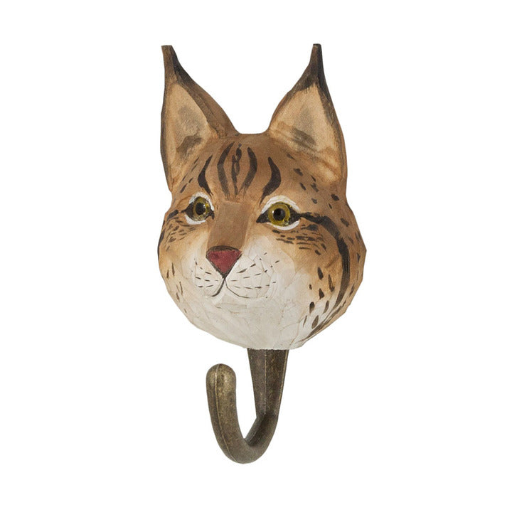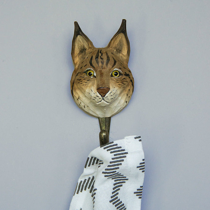 Deze kledinghaak in de vorm van een Lynx is een opvallende toevoeging aan uw interieur. Eeen opvallend en functioneel detail in de hal of de kamer. De afbeeldingen worden ambachtelijk uit hout gesneden en zijn voorzien van een bronskleurige metalen haak. Over de LynxDe Lynx is Eurpa's grootste katachtige en is terug te vinden in vele bossen op het Europese continent. Ze is makkelijk te herkennen aan de licht strepen rondom de ogen en de haarflossen op de oren. Kwaliteit De dieren worden ambachtelijk uit hout gesneden en beschilderd met milieuvriendelijke verf. De haken zijn van brons gekleurd metaal.- Bij elke haak is een boekje bijgesloten met wetenswaardige informatie over het desbetreffende dier.
