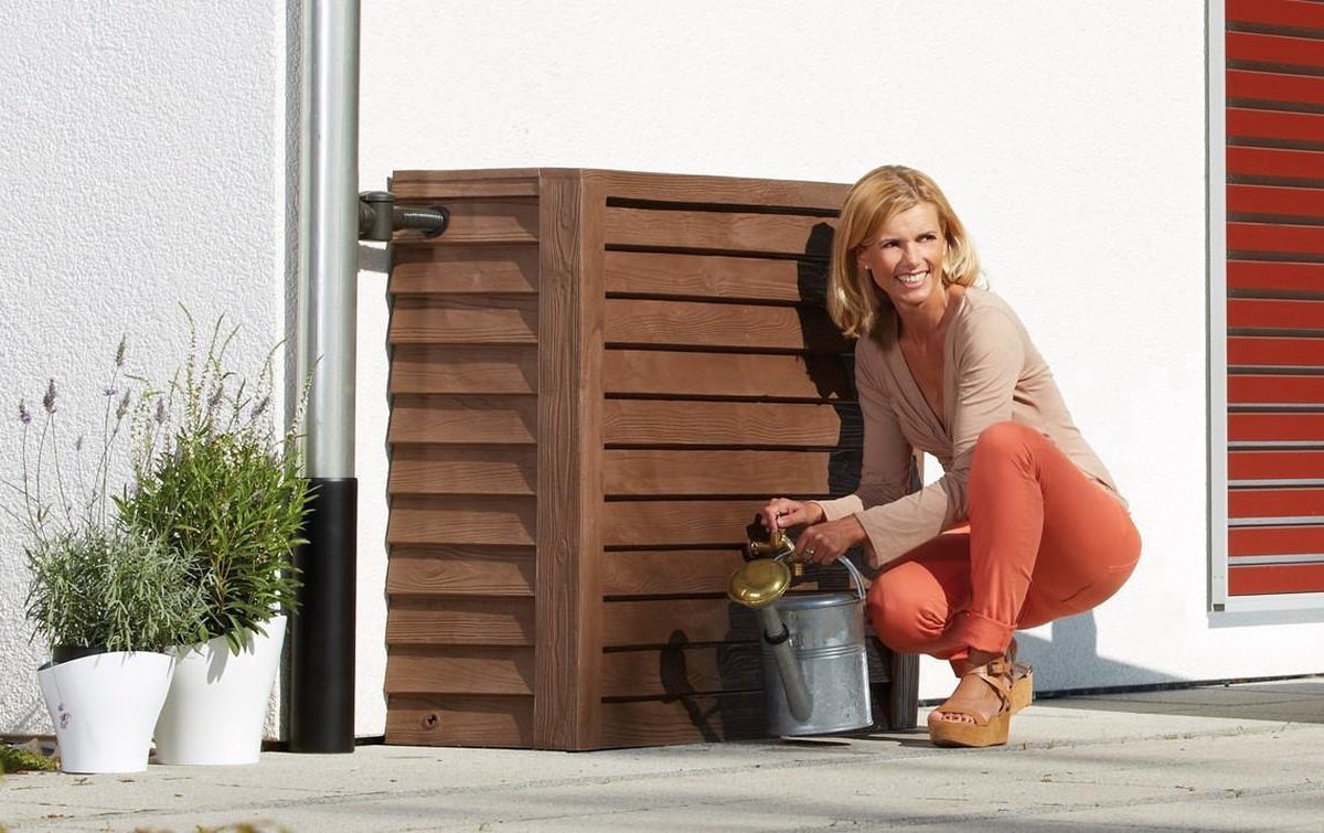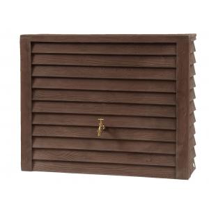Regenton met realistische houtstructuur en inclusief messing kraan. - De structuur is op elke tank anders waardoor elke tank uniek is - Grote opslag met minimaal ruimtegebruik - Voorzien van tap openingen aan beide zijkanten - Winter/vorstbestendig mits leeg en met kraan open - UV stabiel en weersbestendig